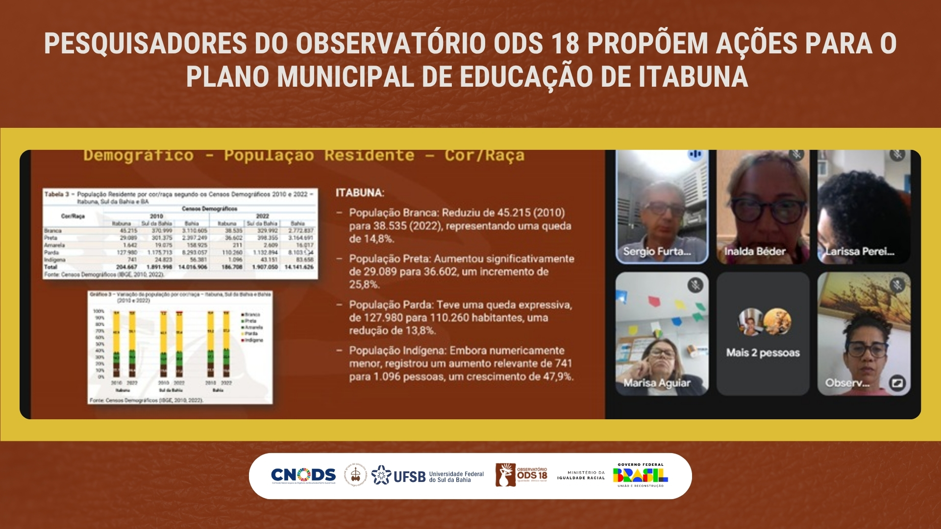 As pesquisadoras do Observatório ODS 18, Inalda Beder e Letícia Pereira, além do pesquisador Sérgio Furtado, participaram de reunião com a equipe técnica da Secretaria de Educação de Itabuna (Seduc), no dia 13 de junho, para apresentar o Diagnóstico Situacional do município e o alinhamento do próximo Plano Municipal de Educação (PME) ao ODS 18 de Igualdade Étnico-Racial.